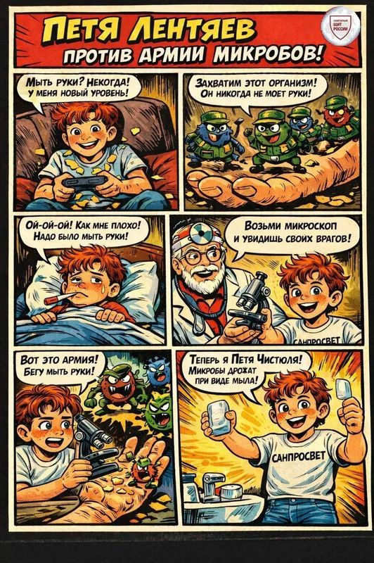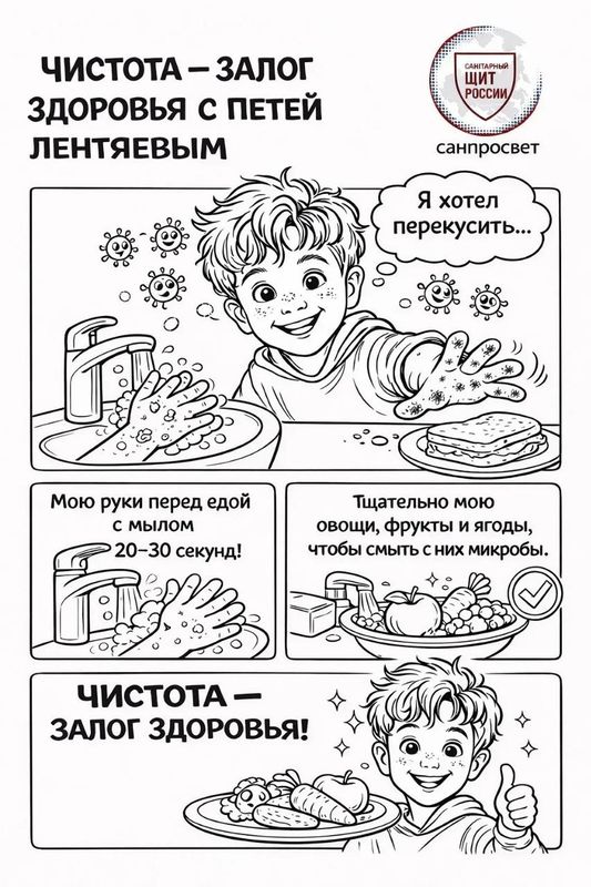 Роспотребнадзор в рамках проекта «Санитарный щит страны — безопасность для здоровья» создал информационно-просветительский комикс для детей и раскраски о правилах личной гигиены и профилактике заболеваний для детей «Чистота — залог здоровья!».
